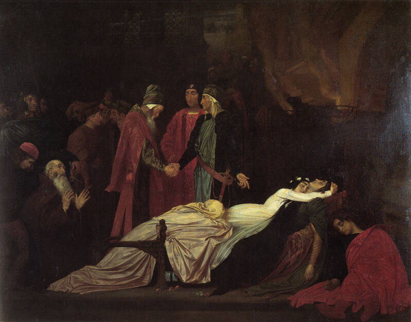 'Het leven is groter dan ik zelf ben'[1] door Hanspeter Nagtegaal, monument waar nabestaanden kunnen stilstaan bij de zelfgekozen dood van een naaste. (Deventerstraat, Apeldoorn.)De tragisch-romantische zelfmoord van Romeo en Julia (Frederic Leighton, 1855)
