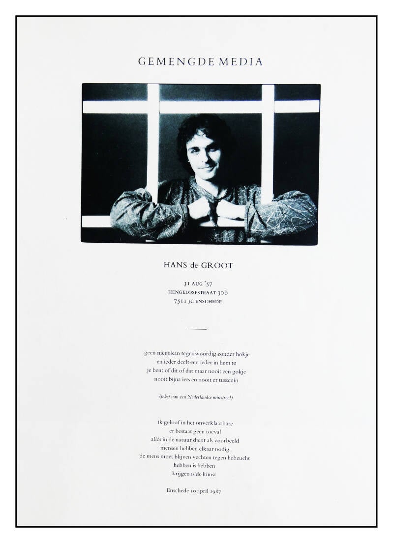 On one side of the "Het Cachot" LP, there were all sorts of songs whose lyrics and melodies deeply touched me. Later, I also learned that he had written lyrics for the famous Dutch artist Willem Nijholt. So it's not without reason that, during my final exam "DE AKI" in Enschede, I had his words placed in the final exam catalog—the words of his beautiful song "DE GROEP" (THE GROUP). With lyrics that, strangely enough, would no longer be permitted these days. Simply because his words could be considered too direct.