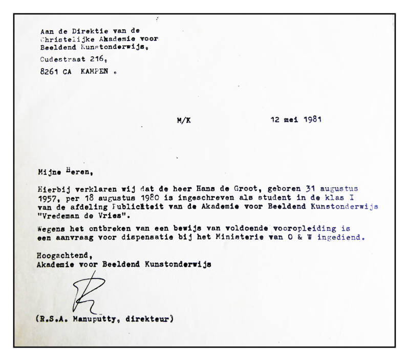 By: Hans de Groot (colleague and fellow student at the time), studied at the Frisian art academy "Vredeman de Vries" (at the time with the unique Surinamese director R.S.A. Manuputty, see attachment).